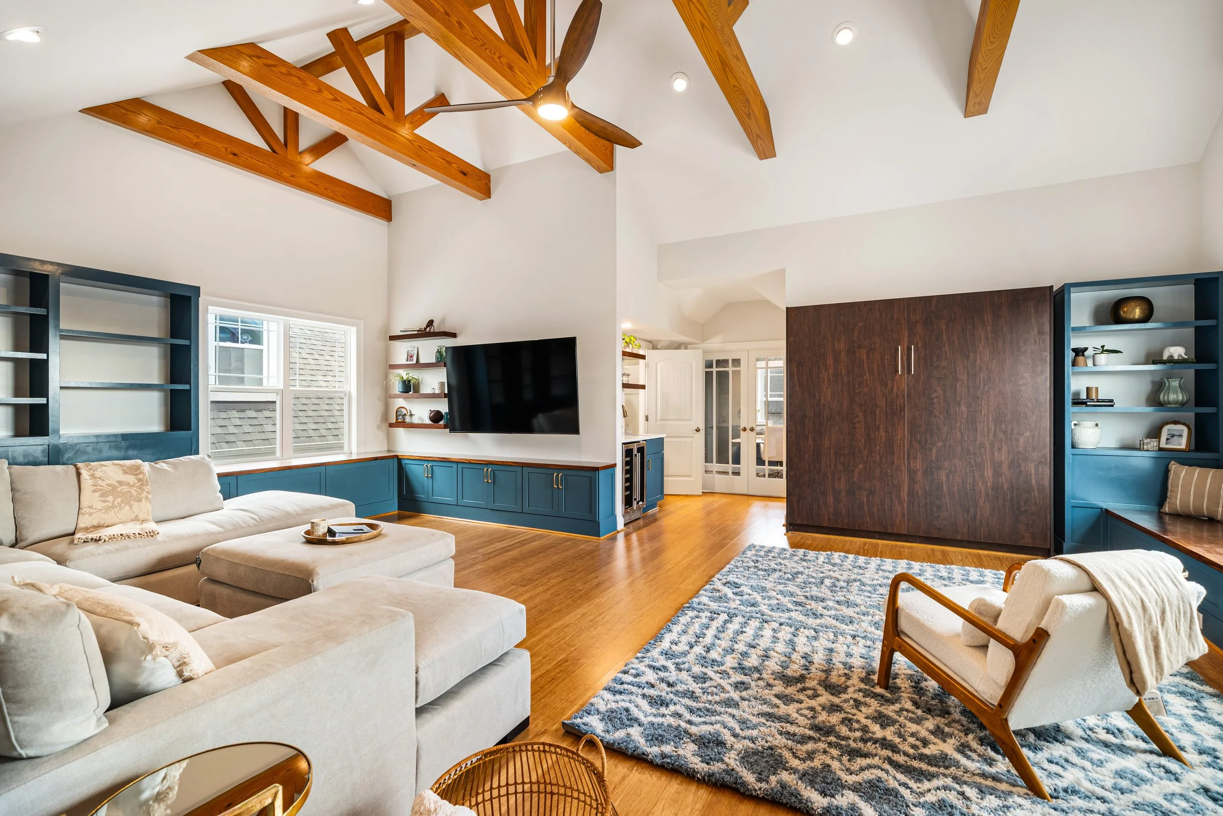 This family was in need of an entertaining space to host movie nights and hangouts. Their unfinished attic transformed into a living room, guest bedroom, bathroom and home office. Complete with a bar, murphy bed, window bench, and lots of shelving for movie memorabilia. Using pattern, texture, and champagne bronze finishes, the look is classic and sophisticated.